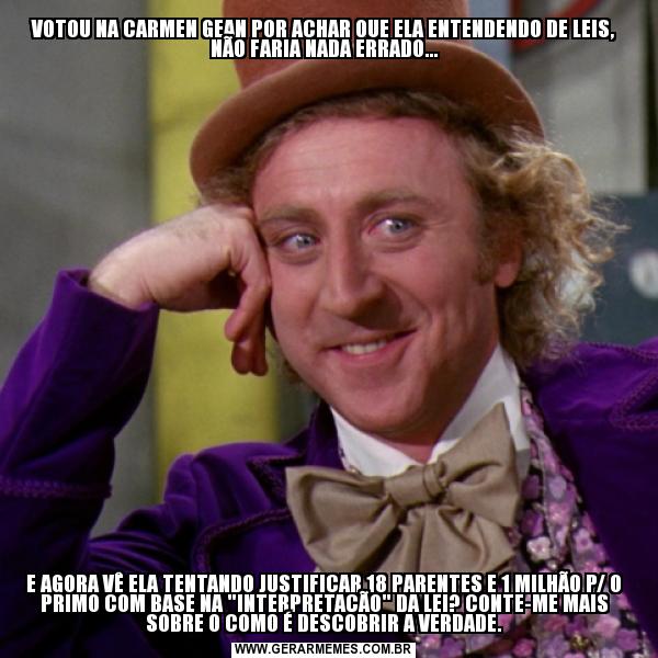 VOTOU NA CARMEN GEAN POR ACHAR QUE ELA ENTENDENDO DE LEIS, NÃO FARIA NADA ERRADO... E AGORA VÊ ELA TENTANDO JUSTIFICAR 18 PARENTES E 1 MILHÃO P/ O PRIMO COM BASE NA "INTERPRETAÇÃO" DA LEI? CONTE-ME MAIS SOBRE O COMO É DESCOBRIR A VERDADE.