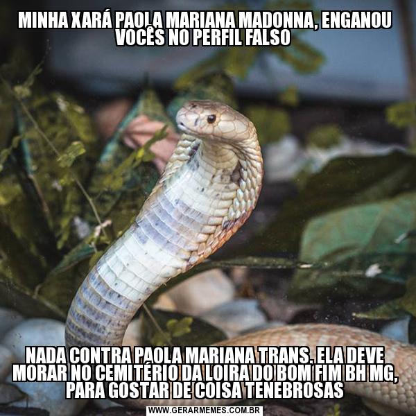 MINHA XARÁ PAOLA MARIANA MADONNA, ENGANOU VOCÊS NO PERFIL FALSO NADA CONTRA PAOLA MARIANA TRANS, ELA DEVE MORAR NO CEMITÉRIO DA LOIRA DO BOM FIM BH MG, PARA GOSTAR DE COISA TENEBROSAS