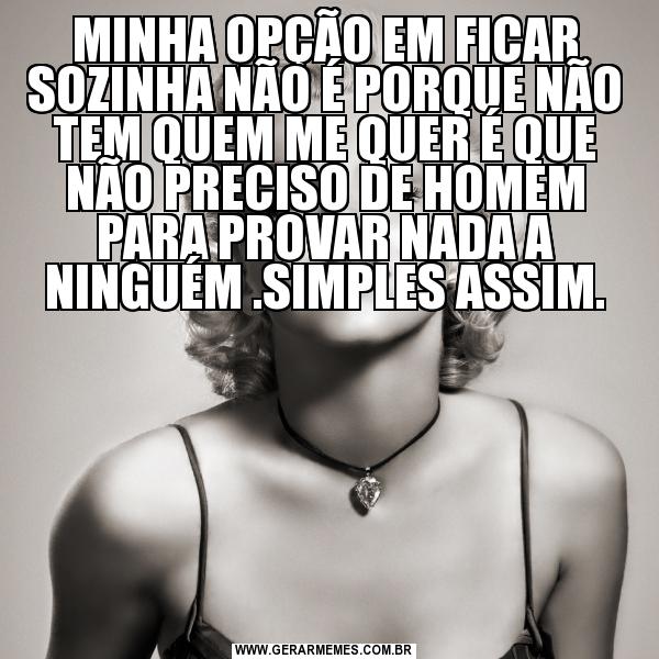 MINHA OPÇÃO EM FICAR SOZINHA NÃO É PORQUE NÃO TEM QUEM ME QUER É QUE NÃO PRECISO DE HOMEM PARA PROVAR NADA A NINGUÉM .SIMPLES ASSIM.