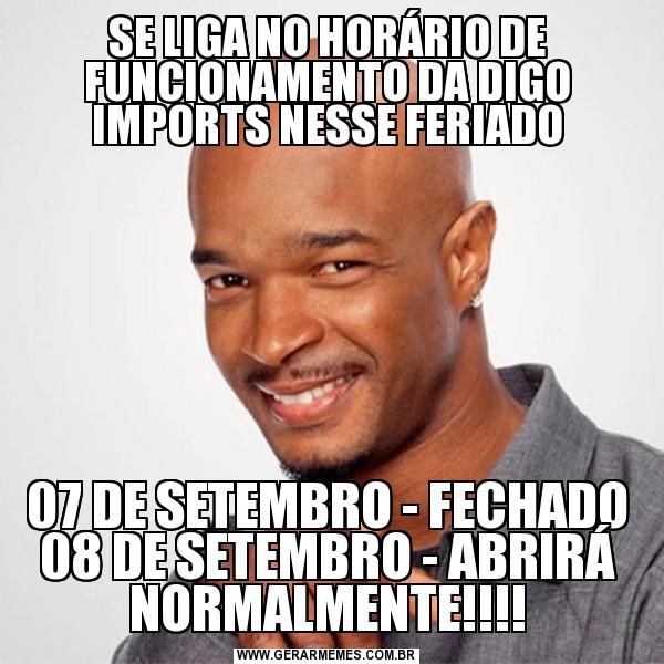 SE LIGA NO HORÁRIO DE FUNCIONAMENTO DA DIGO IMPORTS NESSE FERIADO 07 DE SETEMBRO - FECHADO 08 DE SETEMBRO - ABRIRÁ NORMALMENTE!!!!