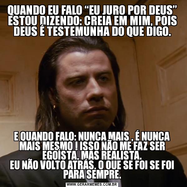 QUANDO EU FALO “EU JURO POR DEUS” ESTOU DIZENDO: CREIA EM MIM, POIS DEUS É TESTEMUNHA DO QUE DIGO. E QUANDO FALO: NUNCA MAIS , É NUNCA MAIS MESMO ! ISSO NÃO ME FAZ SER EGOÍSTA, MAS REALISTA. EU NÃO VOLTO ATRÁS, O QUE SE FOI SE FOI PARA SEMPRE.