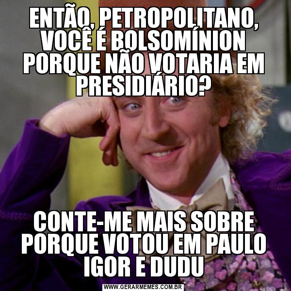 ENTÃO, PETROPOLITANO, VOCÊ É BOLSOMÍNION PORQUE NÃO VOTARIA EM PRESIDIÁRIO? CONTE-ME MAIS SOBRE PORQUE VOTOU EM PAULO IGOR E DUDU