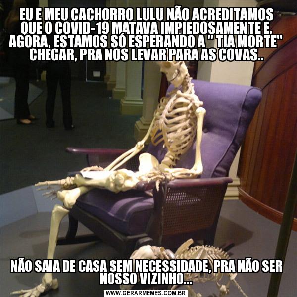 EU E MEU CACHORRO LULU NÃO ACREDITAMOS QUE O COVID-19 MATAVA IMPIEDOSAMENTE E, AGORA, ESTAMOS SÓ ESPERANDO A " TIA MORTE" CHEGAR, PRA NOS LEVAR PARA AS COVAS.. NÃO SAIA DE CASA SEM NECESSIDADE, PRA NÃO SER NOSSO VIZINHO...
