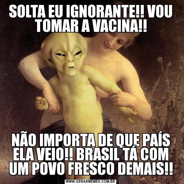SOLTA EU IGNORANTE!! VOU TOMAR A VACINA!! NÃO IMPORTA DE QUE PAÍS ELA VEIO!! BRASIL TÁ COM UM POVO FRESCO DEMAIS!!