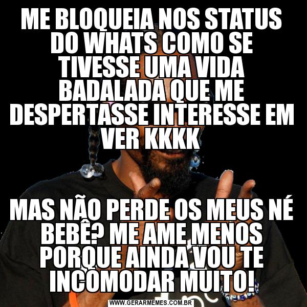 ME BLOQUEIA NOS STATUS DO WHATS COMO SE TIVESSE UMA VIDA BADALADA QUE ME DESPERTASSE INTERESSE EM VER KKKK MAS NÃO PERDE OS MEUS NÉ BEBÊ? ME AME MENOS PORQUE AINDA VOU TE INCOMODAR MUITO!