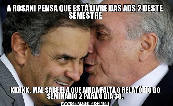 A ROSANI PENSA QUE ESTÁ LIVRE DAS ADS 2 DESTE SEMESTRE KKKKK. MAL SABE ELA QUE AINDA FALTA O RELATÓRIO DO SEMINÁRIO 2 PARA O DIA 30.