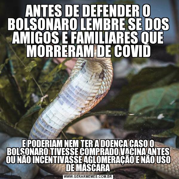 ANTES DE DEFENDER O BOLSONARO LEMBRE SE DOS AMIGOS E FAMILIARES QUE MORRERAM DE COVID E PODERIAM NEM TER A DOENÇA CASO O BOLSONARO TIVESSE COMPRADO VACINA ANTES OU NÃO INCENTIVASSE AGLOMERAÇÃO E NÃO USO DE MÁSCARA