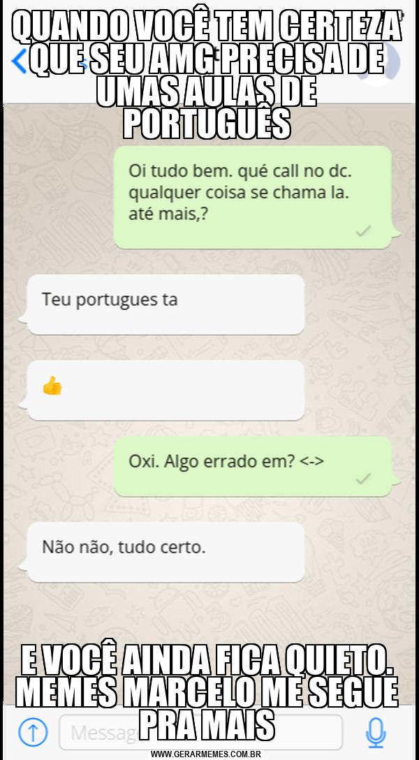 QUANDO VOCÊ TEM CERTEZA QUE SEU AMG PRECISA DE UMAS AULAS DE PORTUGUÊS E VOCÊ AINDA FICA QUIETO. MEMES MARCELO ME SEGUE PRA MAIS