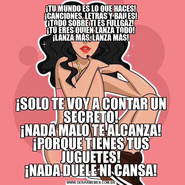 ¡TU MUNDO ES LO QUE HACES! ¡CANCIONES, LETRAS Y BAILES! ¡TODO SOBRE TI ES FULLGÁZ! ¡TÚ ERES QUIEN LANZA TODO! ¡LANZA MÁS, LANZA MÁS! ¡SOLO TE VOY A CONTAR UN SECRETO! ¡NADA MALO TE ALCANZA! ¡PORQUE TIENES TUS JUGUETES! ¡NADA DUELE NI CANSA!