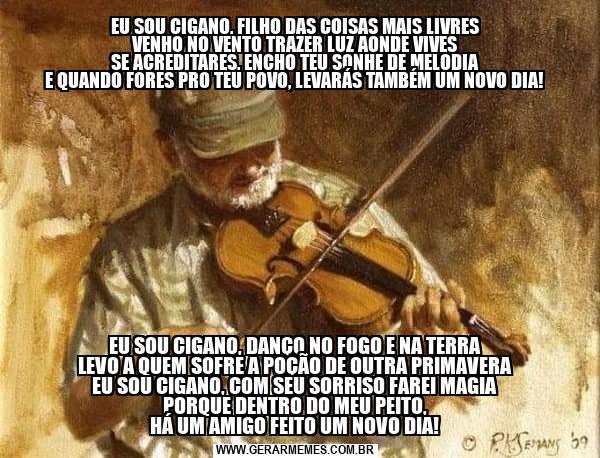 EU SOU CIGANO, FILHO DAS COISAS MAIS LIVRES VENHO NO VENTO TRAZER LUZ AONDE VIVES SE ACREDITARES, ENCHO TEU SONHE DE MELODIA E QUANDO FORES PRO TEU POVO, LEVARÁS TAMBÉM UM NOVO DIA! EU SOU CIGANO, DANÇO NO FOGO E NA TERRA LEVO A QUEM SOFRE A POÇÃO DE OUTRA PRIMAVERA EU SOU CIGANO, COM SEU SORRISO FAREI MAGIA PORQUE DENTRO DO MEU PEITO, HÁ UM AMIGO FEITO UM NOVO DIA!