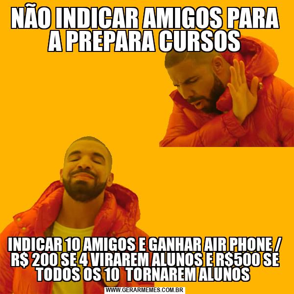 NÃO INDICAR AMIGOS PARA A PREPARA CURSOS INDICAR 10 AMIGOS E GANHAR AIR PHONE / R$ 200 SE 4 VIRAREM ALUNOS E R$500 SE TODOS OS 10 TORNAREM ALUNOS