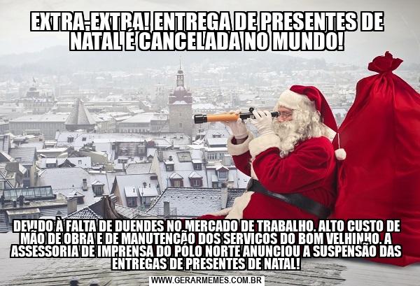 EXTRA-EXTRA! ENTREGA DE PRESENTES DE NATAL É CANCELADA NO MUNDO! DEVIDO À FALTA DE DUENDES NO MERCADO DE TRABALHO, ALTO CUSTO DE MÃO DE OBRA E DE MANUTENÇÃO DOS SERVIÇOS DO BOM VELHINHO, A ASSESSORIA DE IMPRENSA DO PÓLO NORTE ANUNCIOU A SUSPENSÃO DAS ENTREGAS DE PRESENTES DE NATAL!