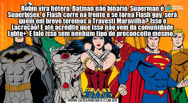Robin vira hétero, Batman não binário, Superman é Superbisex, o Flash corre na frente e se torna Flash gay, será quem em breve teremos a Travesti Maravilha? Isso é Lacração! E até acredito que isso não vem da comunidade Lgbtq+. E falo isso sem nenhum