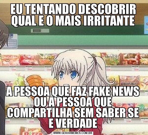 EU TENTANDO DESCOBRIR QUAL E O MAIS IRRITANTE A PESSOA QUE FAZ FAKE NEWS OU A PESSOA QUE COMPARTILHA SEM SABER SE E VERDADE