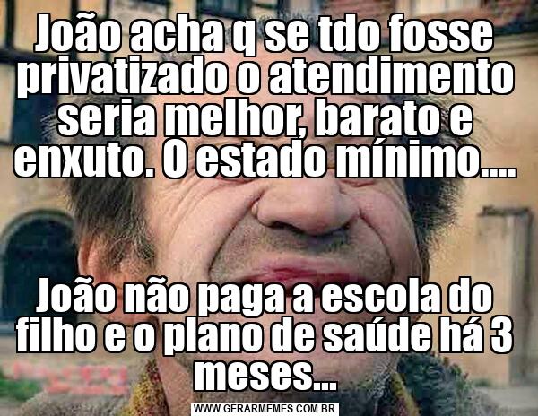 João acha q se tdo fosse privatizado o atendimento seria melhor, barato e enxuto. O estado mínimo.... João não paga a escola do filho e o plano de saúde há 3 meses...