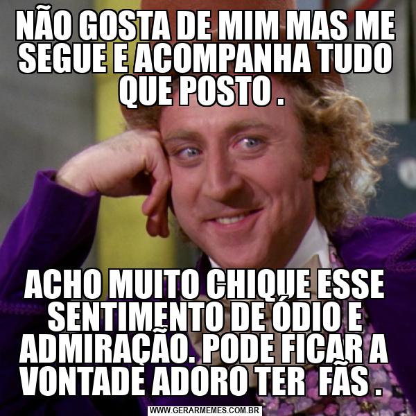 NÃO GOSTA DE MIM MAS ME SEGUE E ACOMPANHA TUDO QUE POSTO . ACHO MUITO CHIQUE ESSE SENTIMENTO DE ÓDIO E ADMIRAÇÃO. PODE FICAR A VONTADE ADORO TER FÃS .