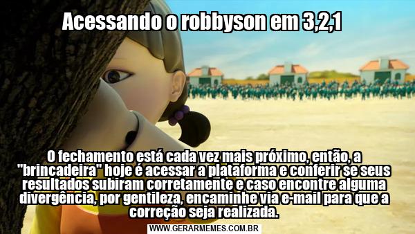 Acessando o robbyson em 3,2,1 O fechamento está cada vez mais próximo, então, a "brincadeira" hoje é acessar a plataforma e conferir se seus resultados subiram corretamente e caso encontre alguma divergência, por gentileza, encaminhe via e-mail para que a correção seja realizada.