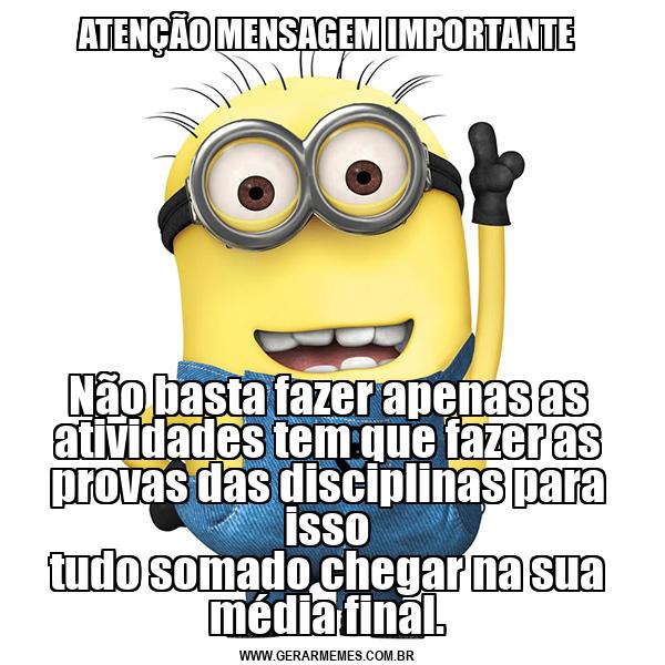 ATENÇÃO MENSAGEM IMPORTANTE Não basta fazer apenas as atividades tem que fazer as provas das disciplinas para isso tudo somado chegar na sua média final.