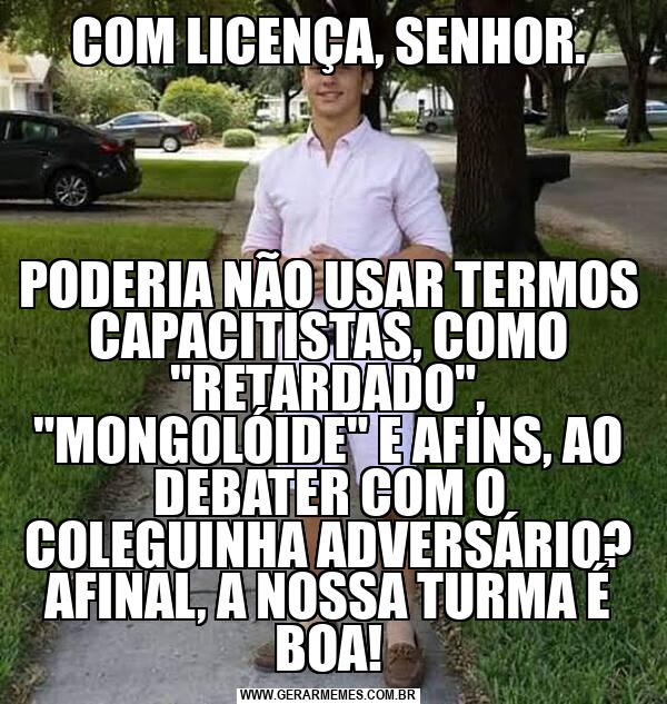 COM LICENÇA, SENHOR. PODERIA NÃO USAR TERMOS CAPACITISTAS, COMO "RETARDADO", "MONGOLÓIDE" E AFINS, AO DEBATER COM O COLEGUINHA ADVERSÁRIO? AFINAL, A NOSSA TURMA É BOA!