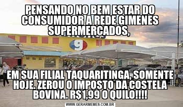 PENSANDO NO BEM ESTAR DO CONSUMIDOR A REDE GIMENES SUPERMERCADOS, EM SUA FILIAL TAQUARITINGA, SOMENTE HOJE. ZEROU O IMPOSTO DA COSTELA BOVINA. R$1,99 O QUILO!!!!
