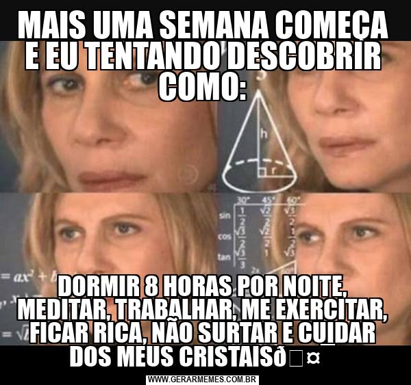 MAIS UMA SEMANA COMEÇA E EU TENTANDO DESCOBRIR COMO: DORMIR 8 HORAS POR NOITE, MEDITAR, TRABALHAR, ME EXERCITAR, FICAR RICA, NÃO SURTAR E CUIDAR DOS MEUS CRISTAIS