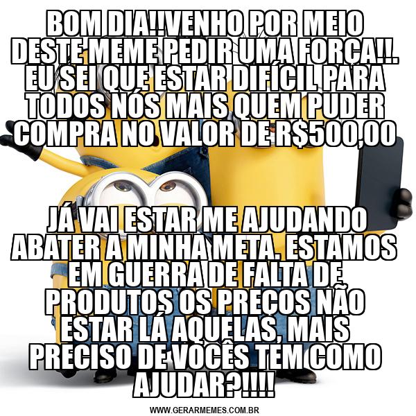 BOM DIA!!VENHO POR MEIO DESTE MEME PEDIR UMA FORÇA!!. EU SEI QUE ESTAR DIFÍCIL PARA TODOS NÓS MAIS QUEM PUDER COMPRA NO VALOR DE R$500,00 JÁ VAI ESTAR ME AJUDANDO ABATER A MINHA META. ESTAMOS EM GUERRA DE FALTA DE PRODUTOS OS PREÇOS NÃO ESTAR LÁ AQUELAS, MAIS PRECISO DE VOCÊS TEM COMO AJUDAR?!!!!