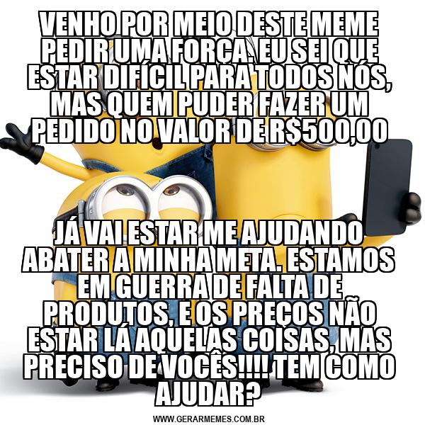 VENHO POR MEIO DESTE MEME PEDIR UMA FORÇA. EU SEI QUE ESTAR DIFÍCIL PARA TODOS NÓS, MAS QUEM PUDER FAZER UM PEDIDO NO VALOR DE R$500,00 JÁ VAI ESTAR ME AJUDANDO ABATER A MINHA META. ESTAMOS EM GUERRA DE FALTA DE PRODUTOS, E OS PREÇOS NÃO ESTAR LÁ AQUELAS COISAS, MAS PRECISO DE VOCÊS!!!! TEM COMO AJUDAR?