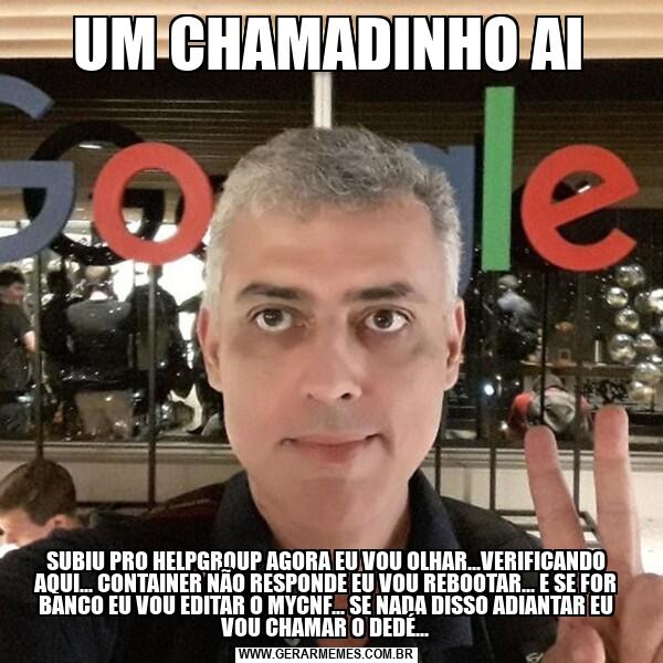 UM CHAMADINHO AI SUBIU PRO HELPGROUP AGORA EU VOU OLHAR...VERIFICANDO AQUI... CONTAINER NÃO RESPONDE EU VOU REBOOTAR... E SE FOR BANCO EU VOU EDITAR O MYCNF... SE NADA DISSO ADIANTAR EU VOU CHAMAR O DEDÉ...