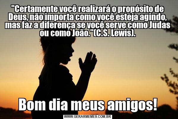 "Certamente você realizará o propósito de Deus, não importa como você esteja agindo, mas faz a diferença se você serve como Judas ou como João."(C.S. Lewis). Bom dia meus amigos!