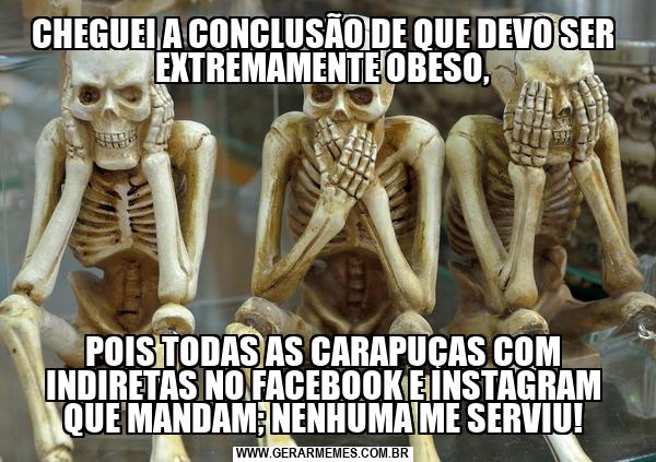 CHEGUEI A CONCLUSÃO DE QUE DEVO SER EXTREMAMENTE OBESO, POIS TODAS AS CARAPUÇAS COM INDIRETAS NO FACEBOOK E INSTAGRAM QUE MANDAM; NENHUMA ME SERVIU!