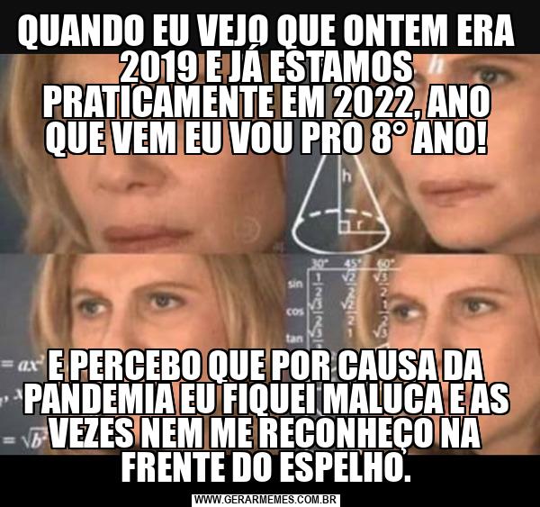 QUANDO EU VEJO QUE ONTEM ERA 2019 E JÁ ESTAMOS PRATICAMENTE EM 2022, ANO QUE VEM EU VOU PRO 8° ANO! E PERCEBO QUE POR CAUSA DA PANDEMIA EU FIQUEI MALUCA E AS VEZES NEM ME RECONHEÇO NA FRENTE DO ESPELHO.
