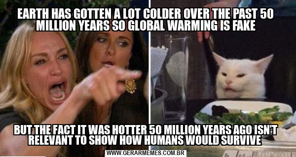 EARTH HAS GOTTEN A LOT COLDER OVER THE PAST 50 MILLION YEARS SO GLOBAL WARMING IS FAKE BUT THE FACT IT WAS HOTTER 50 MILLION YEARS AGO ISN’T RELEVANT TO SHOW HOW HUMANS WOULD SURVIVE