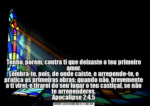Tenho, porém, contra ti que deixaste o teu primeiro amor. Lembra-te, pois, de onde caíste, e arrepende-te, e pratica as primeiras obras; quando não, brevemente a ti virei, e tirarei do seu lugar o teu castiçal, se não te arrependeres. Apocalipse 2: