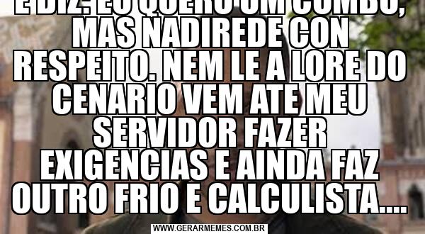 VOCÊ VEM A MINHA GUILDA E DIZ: EU QUERO UM COMBO, MAS NADIREDE CON RESPEITO. NEM LE A LORE DO CENARIO VEM ATE MEU SERVIDOR FAZER EXIGENCIAS E AINDA FAZ OUTRO FRIO E CALCULISTA....