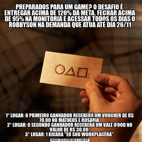 PREPARADOS PARA UM GAME? O DESAFIO É ENTREGAR ACIMA DE 120% DA META, FECHAR ACIMA DE 95% NA MONITORIA E ACESSAR TODOS OS DIAS O ROBBYSON NA DEMANDA QUE ATUA ATÉ DIA 26/11 1° LUGAR: O PRIMEIRO GANHADOR RECEBERÁ UM VOUCHER DE R$ 70,00 NO MATHEUS E ROSÁRIA 2° LUGAR: O SEGUNDO GANHADOR RECEBERÁ UM VALE IFOOD NO VALOR DE R$ 30,00 3° LUGAR: 1 XÍCARA "EU SOU WORKPLACÊRA"