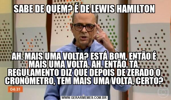 SABE DE QUEM? É DE LEWIS HAMILTON AH, MAIS UMA VOLTA? ESTÁ BOM, ENTÃO É MAIS UMA VOLTA. AH, ENTÃO, TÁ, REGULAMENTO DIZ QUE DEPOIS DE ZERADO O CRONÔMETRO, TEM MAIS UMA VOLTA, CERTO?