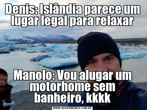 Denis: Islândia parece um lugar legal para relaxar Manolo: Vou alugar um motorhome sem banheiro, kkkk