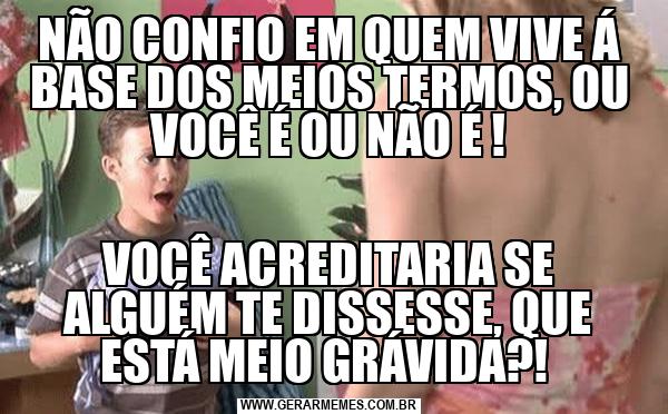 NÃO CONFIO EM QUEM VIVE Á BASE DOS MEIOS TERMOS, OU VOCÊ É OU NÃO É ! VOCÊ ACREDITARIA SE ALGUÉM TE DISSESSE, QUE ESTÁ MEIO GRÁVIDA?!