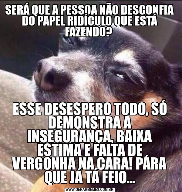 SERÁ QUE A PESSOA NÃO DESCONFIA DO PAPEL RIDÍCULO QUE ESTÁ FAZENDO? ESSE DESESPERO TODO, SÓ DEMONSTRA A INSEGURANÇA, BAIXA ESTIMA E FALTA DE VERGONHA NA CARA! PÁRA QUE JÁ TÁ FEIO...