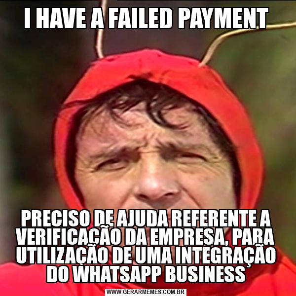 I HAVE A FAILED PAYMENT PRECISO DE AJUDA REFERENTE A VERIFICAÇÃO DA EMPRESA, PARA UTILIZAÇÃO DE UMA INTEGRAÇÃO DO WHATSAPP BUSINESS
