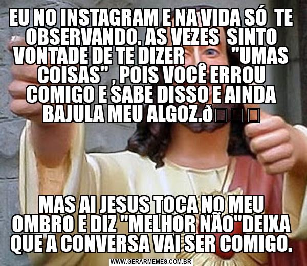 EU NO INSTAGRAM E NA VIDA SÓ TE OBSERVANDO. AS VEZES SINTO VONTADE DE TE DIZER "UMAS COISAS" , POIS VOCÊ ERROU COMIGO E SABE DISSO E AINDA BAJULA MEU ALGOZ. MAS AI JESUS TOCA NO MEU OMBRO E DIZ "MELHOR NÃO"DEIXA QUE A CONVERSA VAI SER COMIGO.
