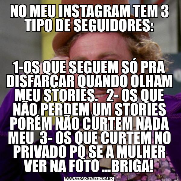 NO MEU INSTAGRAM TEM 3 TIPO DE SEGUIDORES: 1-OS QUE SEGUEM SÓ PRA DISFARÇAR QUANDO OLHAM MEU STORIES. 2- OS QUE NÃO PERDEM UM STORIES PORÉM NÃO CURTEM NADA MEU 3- OS QUE CURTEM NO PRIVADO PQ SE A MULHER VER NA FOTO ...BRIGA!