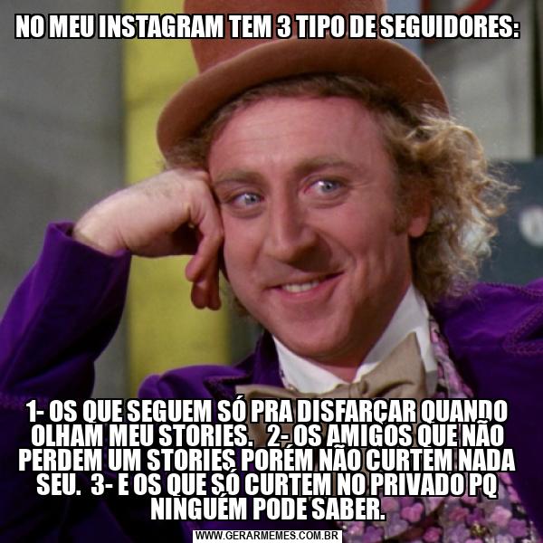 NO MEU INSTAGRAM TEM 3 TIPO DE SEGUIDORES: 1- OS QUE SEGUEM SÓ PRA DISFARÇAR QUANDO OLHAM MEU STORIES. 2- OS AMIGOS QUE NÃO PERDEM UM STORIES PORÉM NÃO CURTEM NADA SEU. 3- E OS QUE SÓ CURTEM NO PRIVADO PQ NINGUÉM PODE SABER.