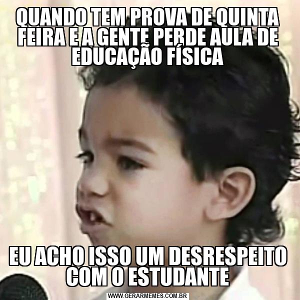 QUANDO TEM PROVA DE QUINTA FEIRA E A GENTE PERDE AULA DE EDUCAÇÃO FÍSICA EU ACHO ISSO UM DESRESPEITO COM O ESTUDANTE