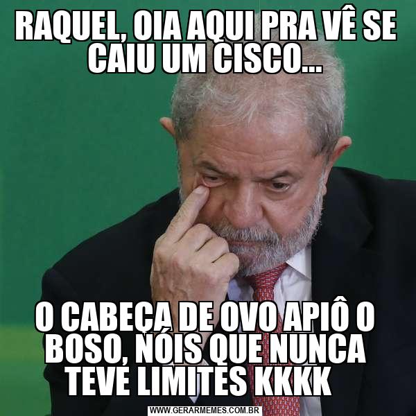 RAQUEL, OIA AQUI PRA VÊ SE CAIU UM CISCO... O CABEÇA DE OVO APIÔ O BOSO, NÓIS QUE NUNCA TEVE LIMITES KKKK