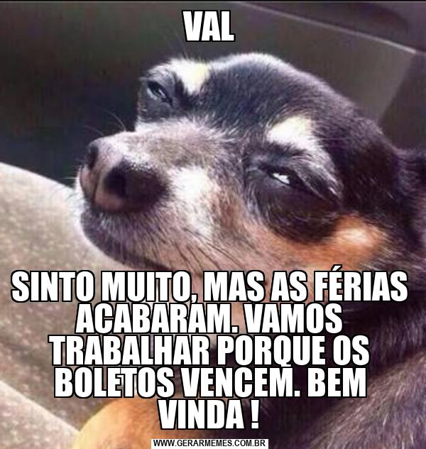 VAL SINTO MUITO, MAS AS FÉRIAS ACABARAM. VAMOS TRABALHAR PORQUE OS BOLETOS VENCEM. BEM VINDA !