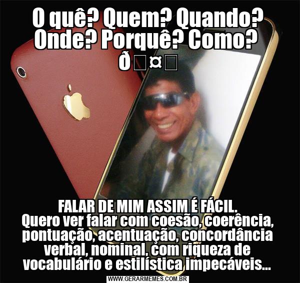 O quê? Quem? Quando? Onde? Porquê? Como? FALAR DE MIM ASSIM É FÁCIL. Quero ver falar com coesão, coerência, pontuação, acentuação, concordância verbal, nominal, com riqueza de vocabulário e estilística impecáveis...