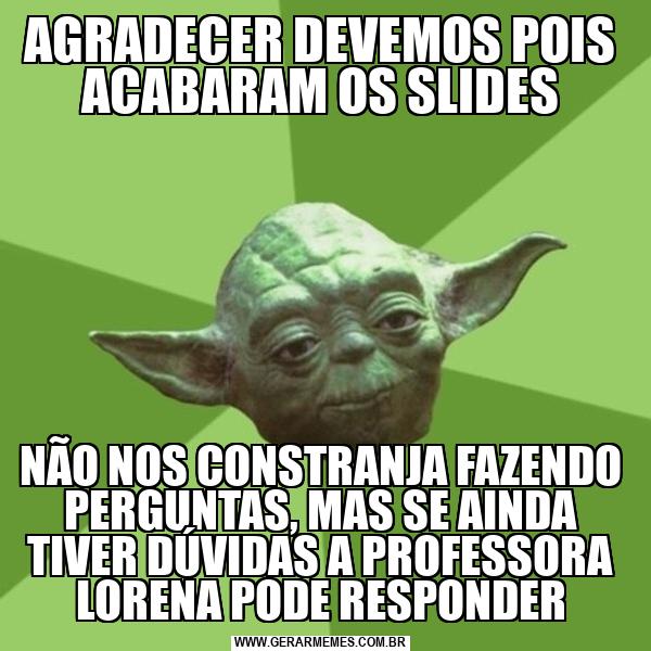 AGRADECER DEVEMOS POIS ACABARAM OS SLIDES NÃO NOS CONSTRANJA FAZENDO PERGUNTAS, MAS SE AINDA TIVER DÚVIDAS A PROFESSORA LORENA PODE RESPONDER