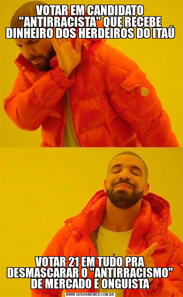 VOTAR EM CANDIDATO "ANTIRRACISTA" QUE RECEBE DINHEIRO DOS HERDEIROS DO ITAÚ VOTAR 21 EM TUDO PRA DESMASCARAR O "ANTIRRACISMO" DE MERCADO E ONGUISTA