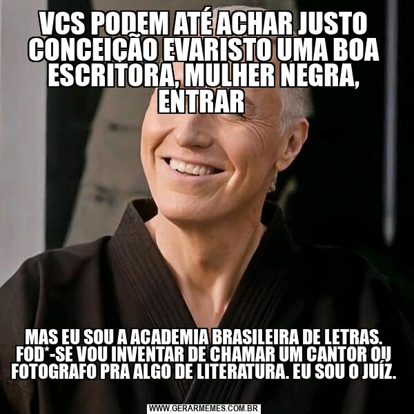 VCS PODEM ATÉ ACHAR JUSTO CONCEIÇÃO EVARISTO UMA BOA ESCRITORA, MULHER NEGRA, ENTRAR MAS EU SOU A ACADEMIA BRASILEIRA DE LETRAS. FOD*-SE VOU INVENTAR DE CHAMAR UM CANTOR OU FOTOGRAFO PRA ALGO DE LITERATURA. EU SOU O JUÍZ.